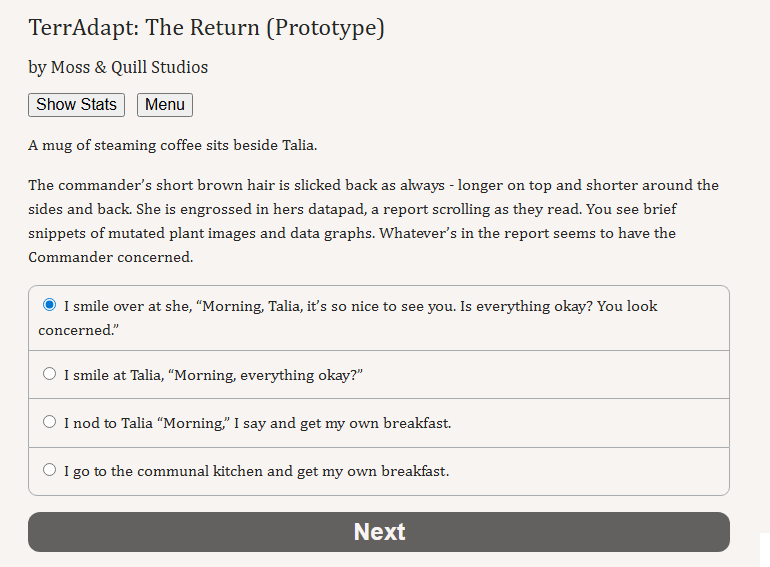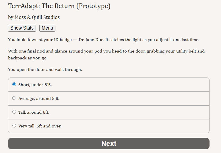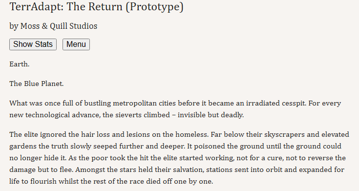| Tags | character-driven, choicescript, mutated-flora, Post-apocalyptic, research-focused, romance-optional, Sci-fi, slow-burn-story, Text based |